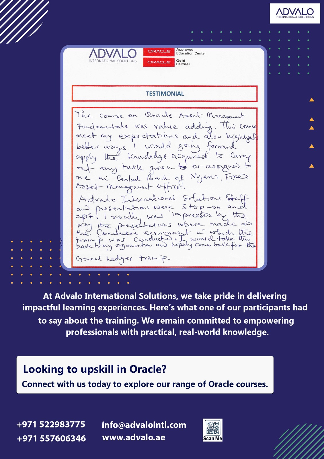 I am pleased to share my experience in the Oracle Exadata Training at Advalo International Solutions in Dubai. Over the course of five days, I found the trainer to be incredibly valuable and enriching. The instructor was knowledgeable, engaging and effectively conveyed complex concepts. I gained a wealth of information and skills that will undoubtably benefit me in my professional endeavors. I highly recommend this training to anyone looking to deepen their understating of Oracle Exadata.